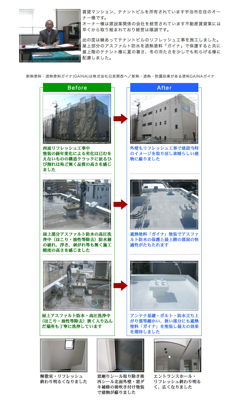 TOP> 施工事例> お客様の声 お客様の声 株式会社日進関西がガイナを施工させて頂きましたお客様の声を掲載しております。随時、更新予定ですので、是非ご参考下さい。 お客様の声5 お客様の声4 お客様の声3 お客様の声2 お客様の声1 ●夏場のデータを見る>【PDFデータにてご確認頂けます】●冬場のデータを見る>【PDFデータにてご確認頂けます】 お客様の声5 お客様の声4 お客様の声3 お客様の声2 お客様の声1